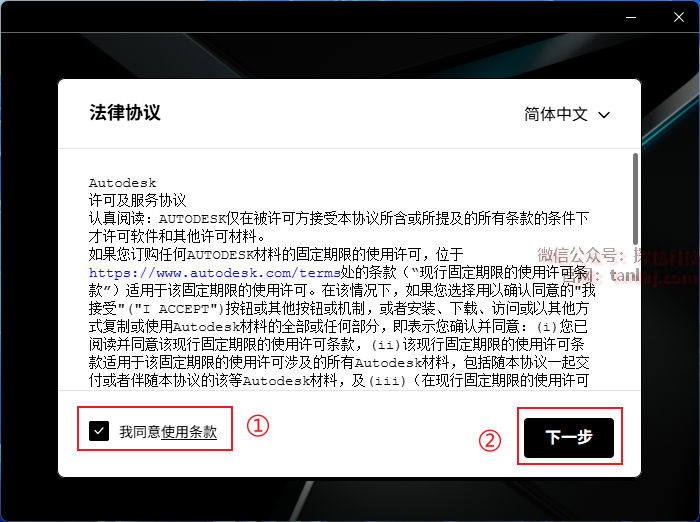 ①勾选【我同意使用条款】;