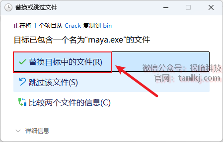 点击【替换目标中的文件】。