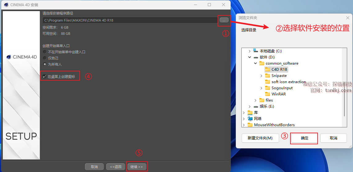 更改软件默认的安装位置,如不需更改,直接勾选【在桌面上创建图标】,点击【继续】即可。