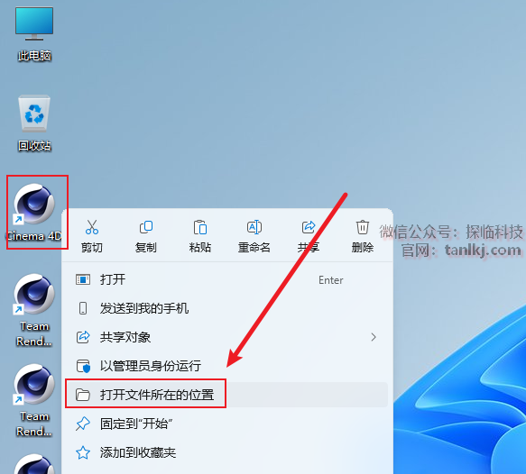 在桌面,右键软件【Cinema 4D】,点击【打开文件所在的位置】。
