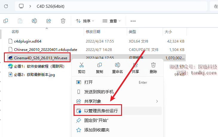 打开解压后的文件夹,右键程序【Cinema4D_S26_26.013_Win】,点击【以管理员身份运行】。