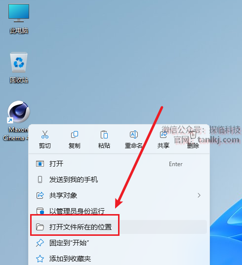 在桌面,右键软件【Maxon Cinema 4D 26】,点击【打开文件所在的位置】。
