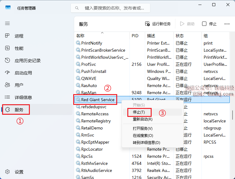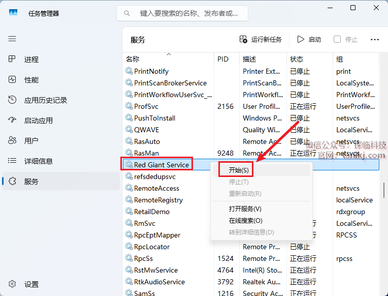 回到任务管理器窗口中,右键服务【Red Giant Service】,点击【开始】。
