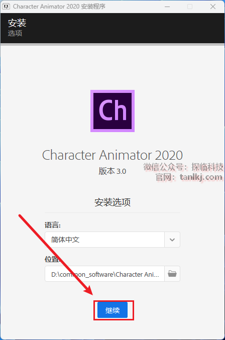 更改软件默认的安装位置,如不需更改,直接点击【继续】即可。