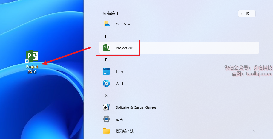 找到程序【Project 2016】,将其拖至桌面创建桌面快捷方式。