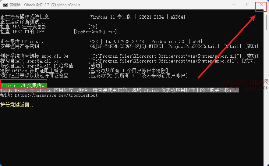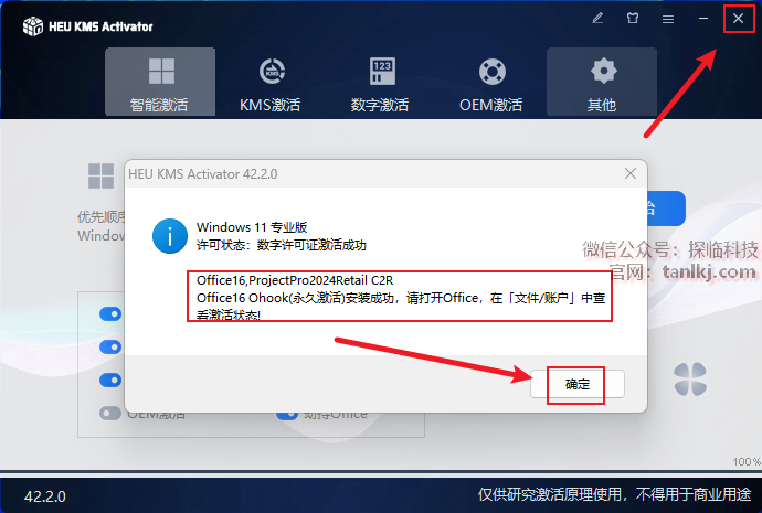 提示激活成功后,点击【确定】,点击右上角的【X】关闭程序。