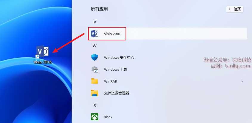 找到程序【Visio 2016】,将其拖至桌面创建桌面快捷方式。