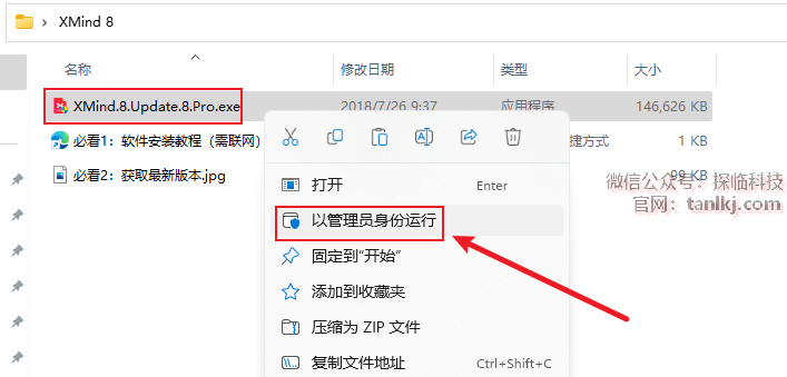 打开解压后的文件夹,右键安装程序【XMind.8.Updata.8.Pro】,点击【以管理员身份运行】。