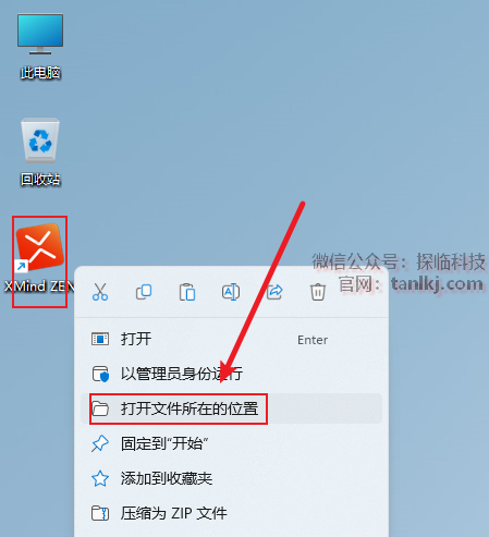 在桌面,右键软件【XMind ZEN】,点击【打开文件所在的位置】。