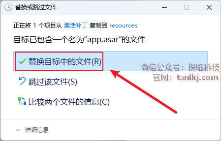 点击【替换目标中的文件】。