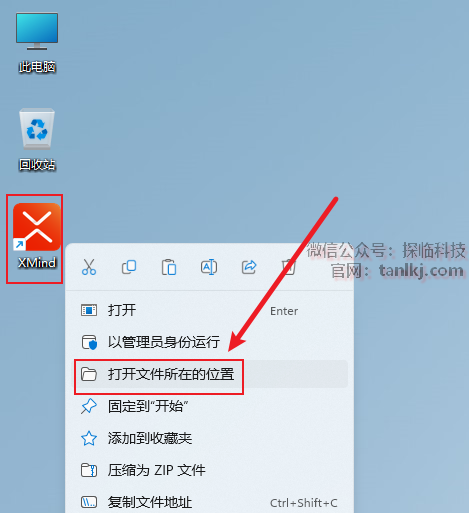 在桌面,右键软件【XMind】,点击【打开文件所在的位置】。