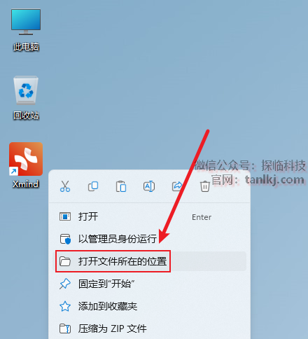 在桌面,右键软件【XMind】,点击【打开文件所在的位置】。