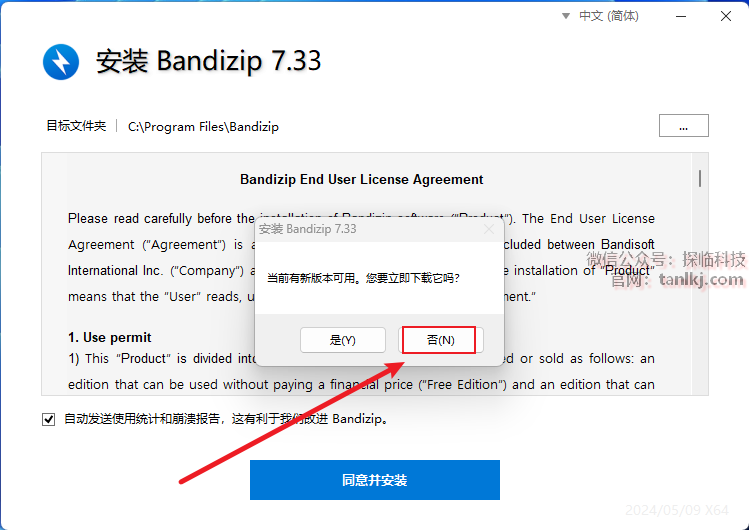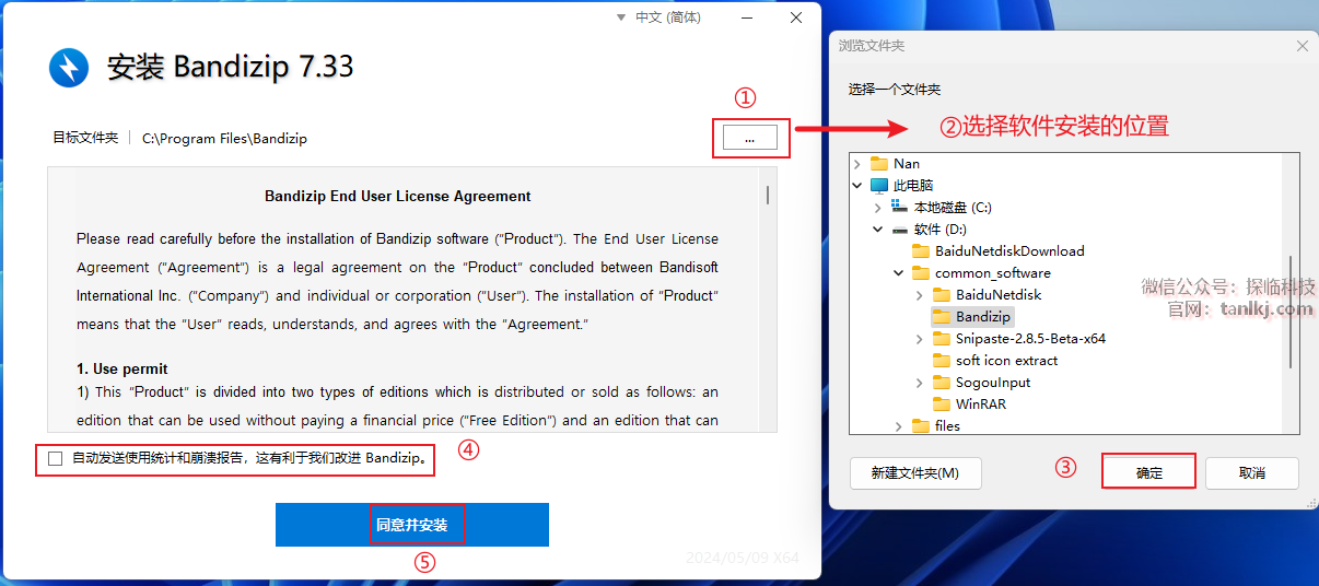 更改软件默认的安装位置,如不需更改,去掉勾选【自动发送使用…】,点击【同意并安装】即可。