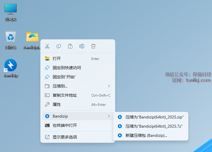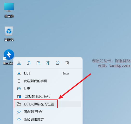 在桌面,右键软件【Bandizip】,点击【打开文件所在的位置】。