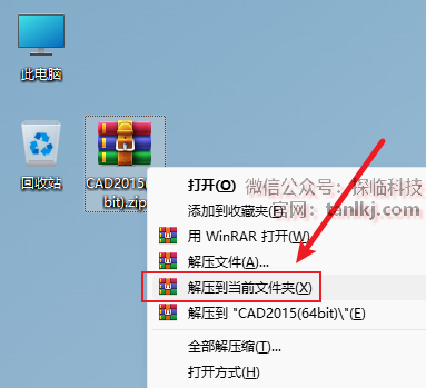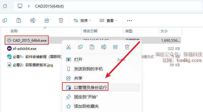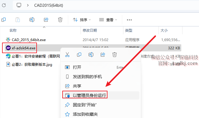 打开解压后的文件夹,右键程序【CAD_2015_64bit】,点击【以管理员身份运行】。