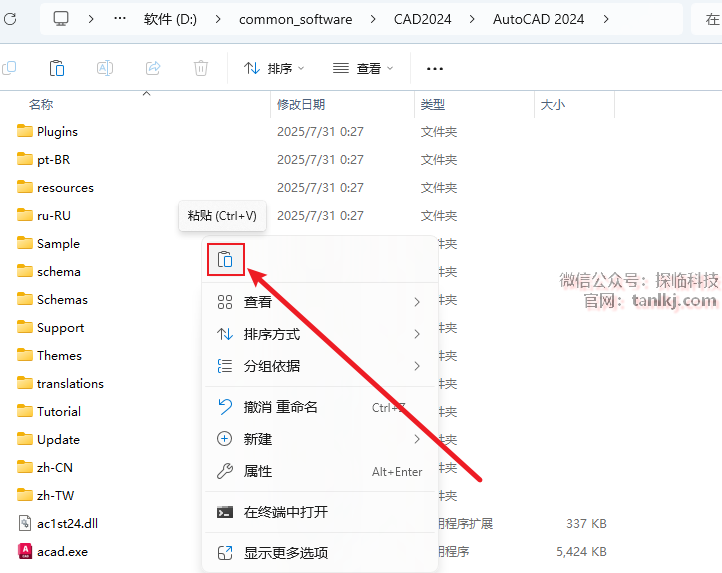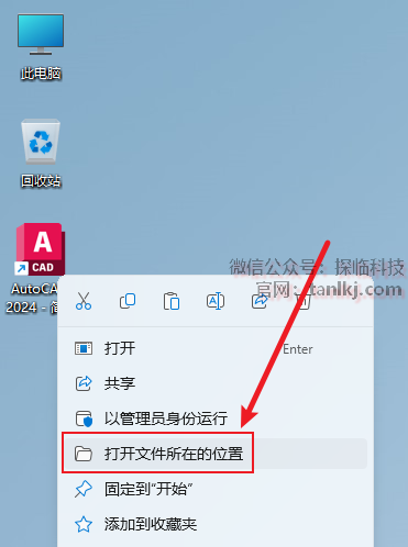 在桌面,右键软件【AutoCAD 2024】,点击【打开文件所在的位置】。