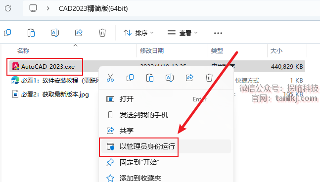 打开解压后的文件夹,右键程序【AutoCAD_2023】,点击【以管理员身份运行】。