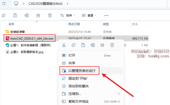 打开解压后的文件夹,右键程序【AutoCAD_2026…】,点击【以管理员身份运行】。