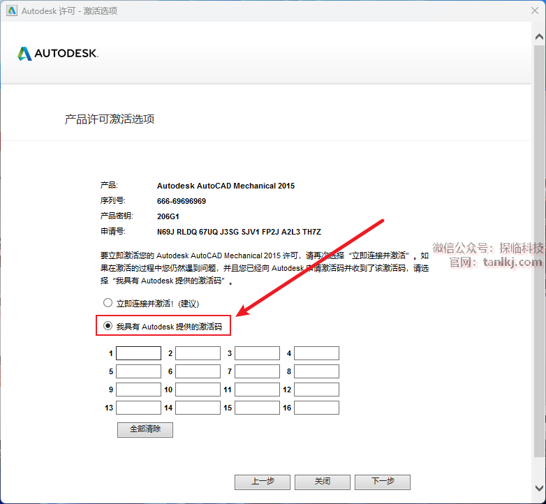 勾选【我具有Autodesk提供的激活码】。