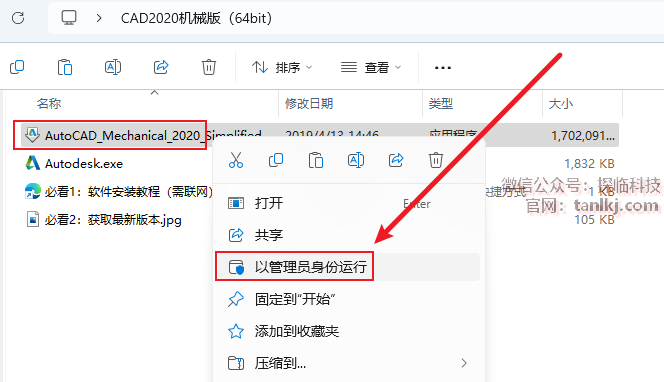 打开解压后的文件夹,右键程序【AutoCAD_Mechanical…】,点击【以管理员身份运行】。