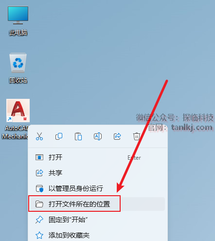 在桌面,右键软件【AutoCAD Mechanical…】,点击【打开文件所在的位置】。