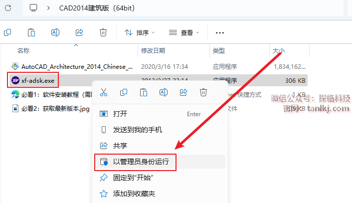 打开之前解压后的文件夹,右键程序【xf-adsk】,点击【以管理员身份运行】。