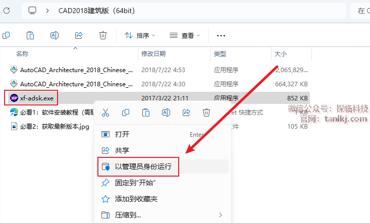 打开之前解压后的文件夹,右键程序【xf-adsk】,点击【以管理员身份运行】。
