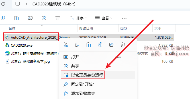 打开解压后的文件夹,右键程序【AutoCAD_Architecture…】,点击【以管理员身份运行】。
