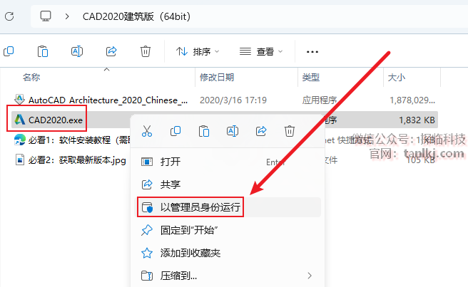 打开之前解压后的文件夹,右键程序【CAD2020】,点击【以管理员身份运行】。