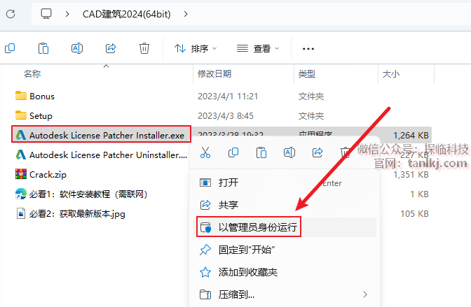 右键刚刚解压出来的文件【Autodesk License Patcher Installer】,点击【以管理员身份运行】。