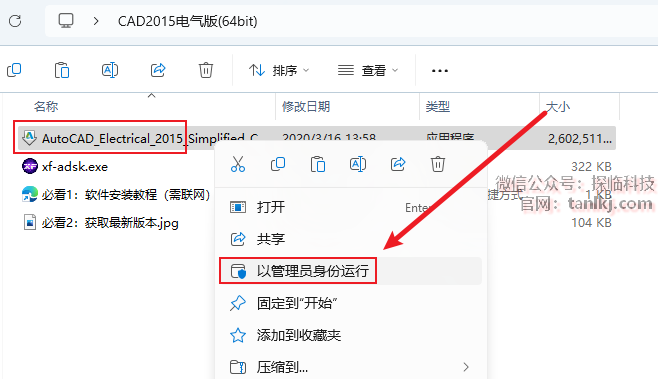 打开解压后的文件夹,右键程序【AutoCAD_Electrical…】,点击【以管理员身份运行】。