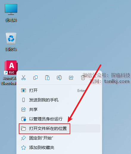 在桌面,右键软件【AutoCAD Electrical…】,点击【打开文件所在的位置】。