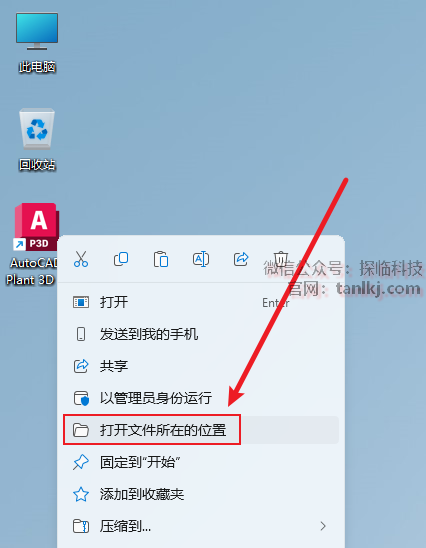 在桌面,右键软件【AutoCAD Plant…】,点击【打开文件所在的位置】。