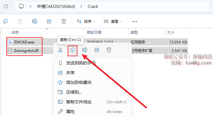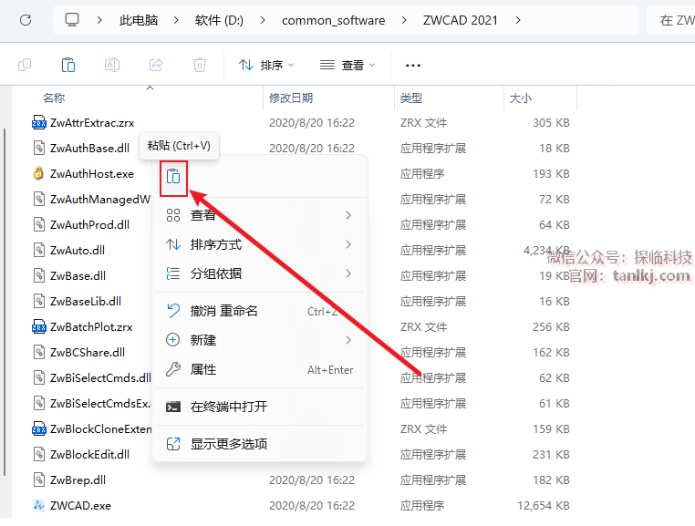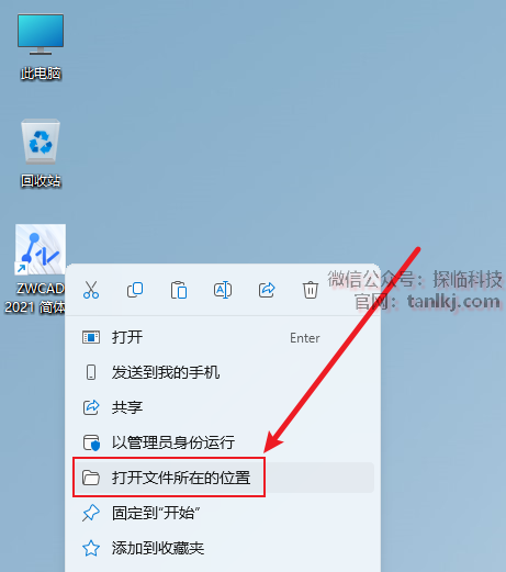在桌面,右键软件【ZWCAD2021…】,点击【打开文件所在的位置】。