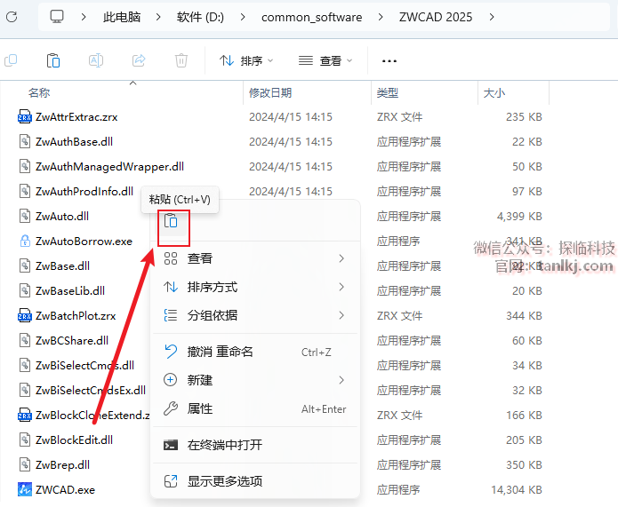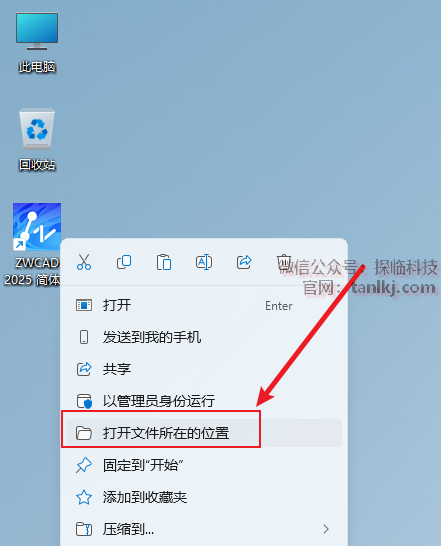 在桌面,右键软件【ZWCAD2025…】,点击【打开文件所在的位置】。