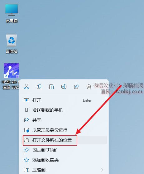 在桌面,右键软件【中望CAD机械版2025】,点击【打开文件所在的位置】。