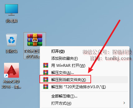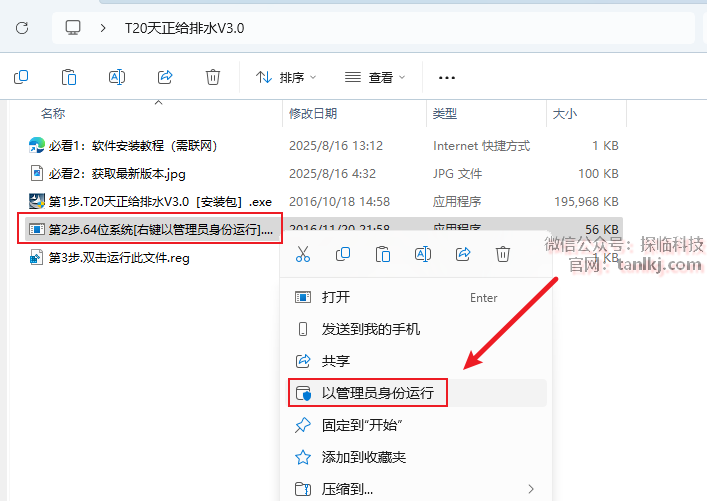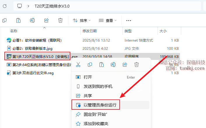 打开解压后的文件夹,右键程序【第1步.T20天正给排水…】,点击【以管理员身份运行】。
