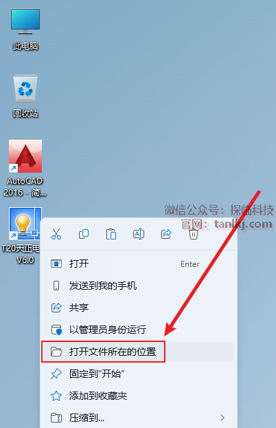 在桌面,右键软件【T20天正电气V6.0】,点击【打开文件所在的位置】。