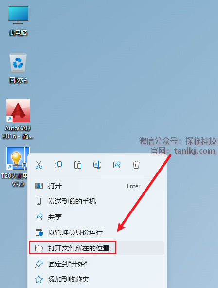 在桌面,右键软件【T20天正电气V7.0】,点击【打开文件所在的位置】。