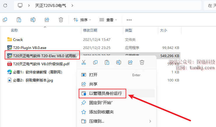 打开解压后的文件夹,右键程序【T20天正电气软件T20-Elec V8.0 试用版】,点击【以管理员身份运行】。