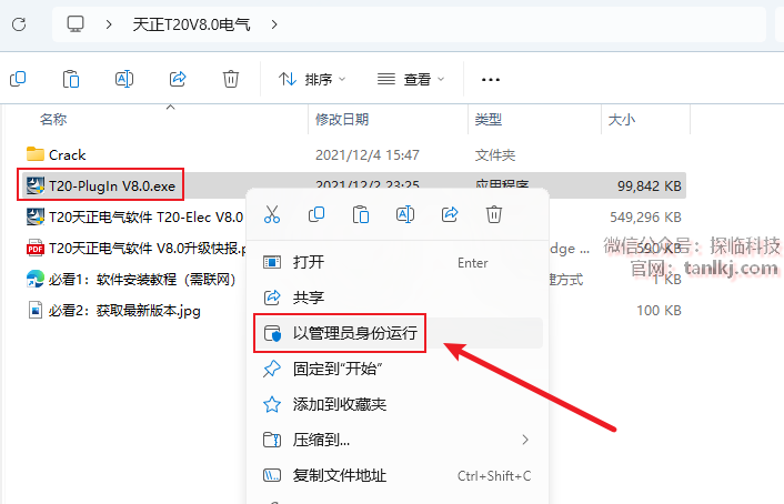 打开之前解压后的文件夹,右键程序【T20-PlugIn V8.0】,点击【以管理员身份运行】。