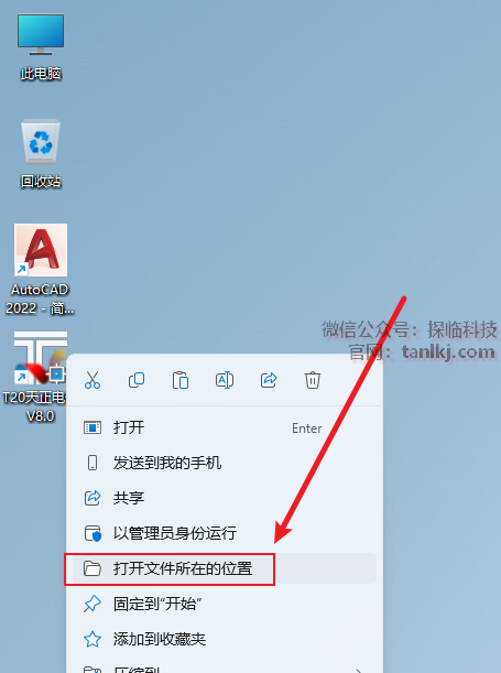 在桌面,右键软件【T20天正电气V8.0】,点击【打开文件所在的位置】。