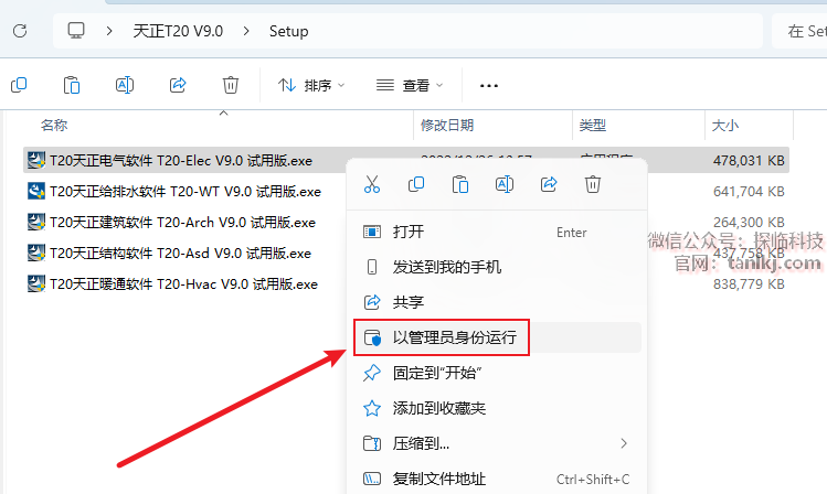 根据自己需求,右键相应产品(这里以天正电气为演示),点击【以管理员身份运行】。