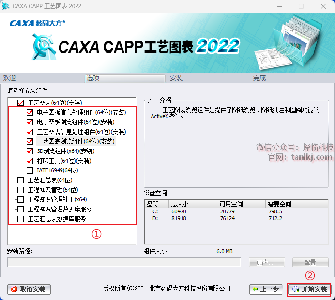 更改软件默认的安装位置,如不需更改,选择需要安装的组件后,点击【开始安装】即可。