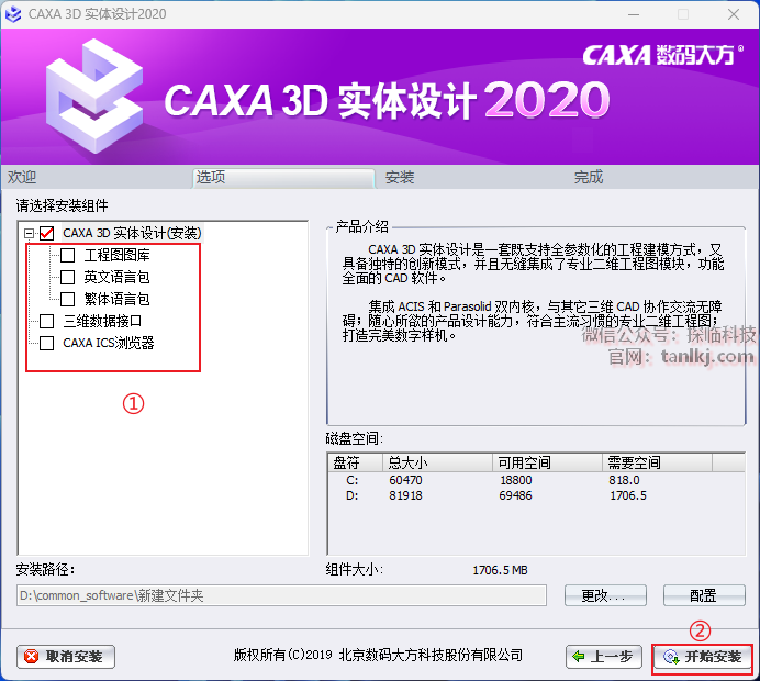 更改软件默认的安装位置,如不需更改,选择需要安装的组件后,点击【开始安装】即可。