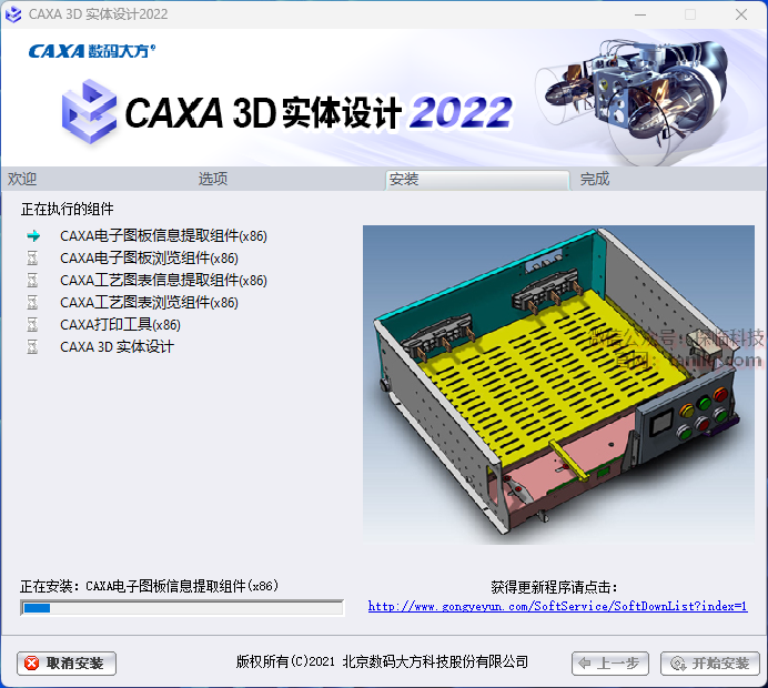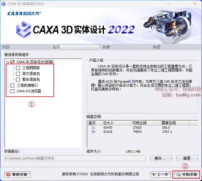 更改软件默认的安装位置,如不需更改,选择需要安装的组件后,点击【开始安装】即可。