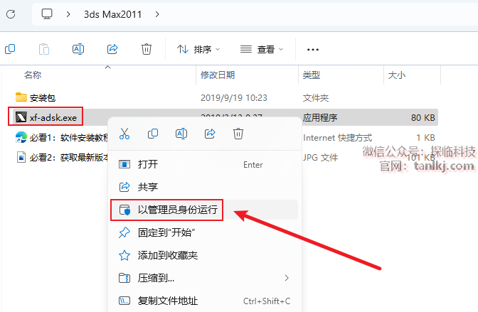打开之前解压后的文件夹,右键程序【xf-adsk】,点击【以管理员身份运行】。