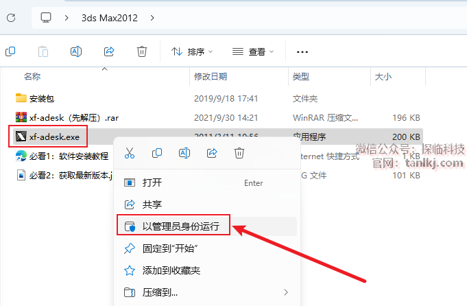 右键解压出来的程序【xf-adesk】,点击【以管理员身份运行】。