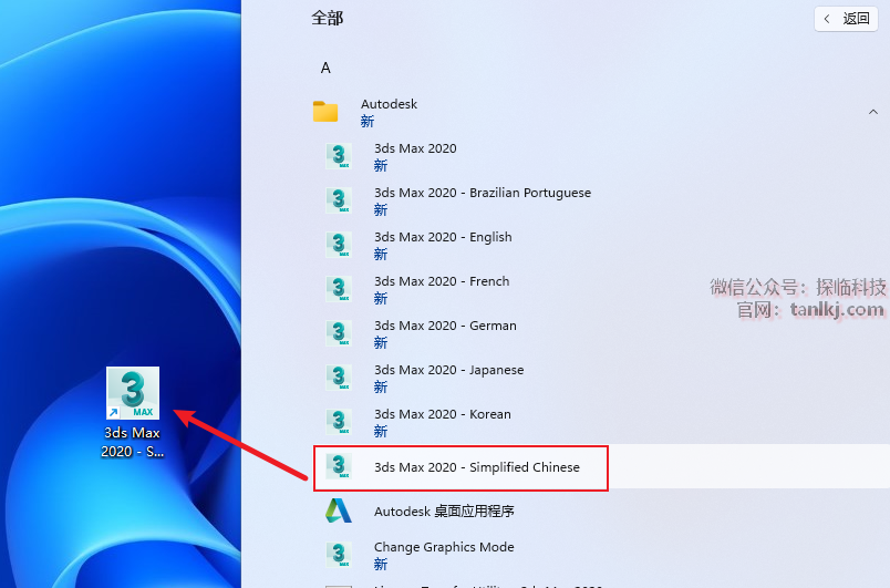 找到并打开文件夹【Autodesk】,将软件【3ds Max 2020 – Simplified Chinese】拖至桌面创建快捷方式。