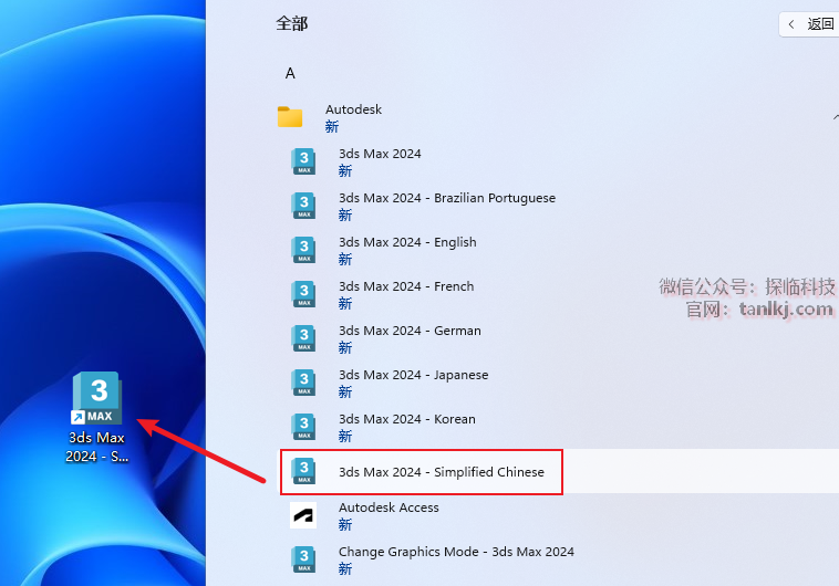 找到并打开文件夹【Autodesk】,将软件【3ds Max 2024 – Simplified Chinese】拖至桌面创建快捷方式。
